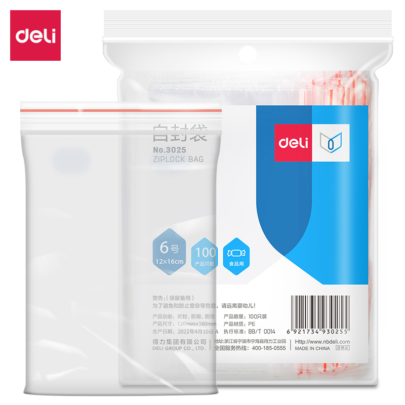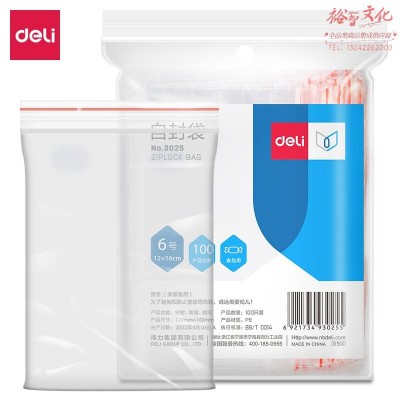 首页 > 用具 > 其他厨房用具 > 得力(deli)食品自封袋6号17*12cm 加厚防水PE透明密封袋密实袋封口袋 收纳封口胶袋防尘密封袋100只透明 3025(zhyghf_982500200)SKU:yzwhyp889455
