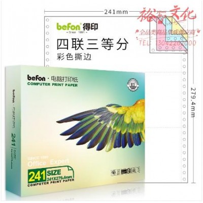 首页 > 纸及纸质品 > 纸及纸板(不包含复印纸) > 得印(befon)四联三等分打印纸 彩色 针式电脑打印纸 241-4-1/3( 80列 撕边 600页/1箱) (zhyghf_221711488)SKU:yzwhyp889632