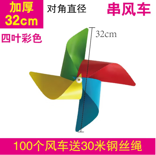 首页 > 建筑建材 > 装饰材料 > 米魁 风车装饰户外旋转幼儿园小风车景区悬挂塑料风车串玩具风车 加厚四彩32cm/100个 30米钢绳 (zhyghf_221718357)SKU:yzwhyp892143
