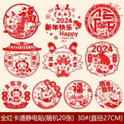 欧妮姿 元旦装饰剪纸窗花新年装饰龙年春节过年福字贴画布置全红卡通20张 (zhyghf_221718592)SKU:yzwhyp892315
