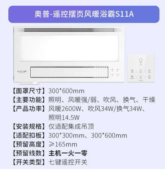 奥普(AUPU)浴霸S11A风暖浴霸 宽摆页出风 强弱风暖 无线遥控 适配集成吊顶(zhyghf_23094305)SKU:yzwhyp894065