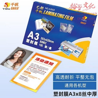 千帆(YIDU SAILS)塑封膜A3 8C照片过塑膜相片过胶膜透明护卡膜塑封纸过塑纸 303x426MMx8丝 100张SKU:yzwhyp902567