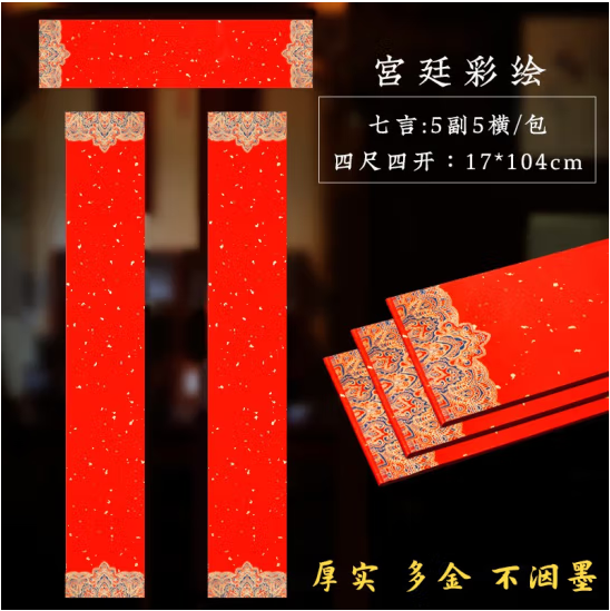 首页 > 办公用品 > 文具 > 善琏湖笔 空白对联手写春联纸万年红宣纸对联纸大红纸毛笔字书法作品创作半生半熟蜡染宣纸七言 宫廷彩绘17*104CM 5副七言 (zhyghf_23096716)SKU:yzwhyp903899