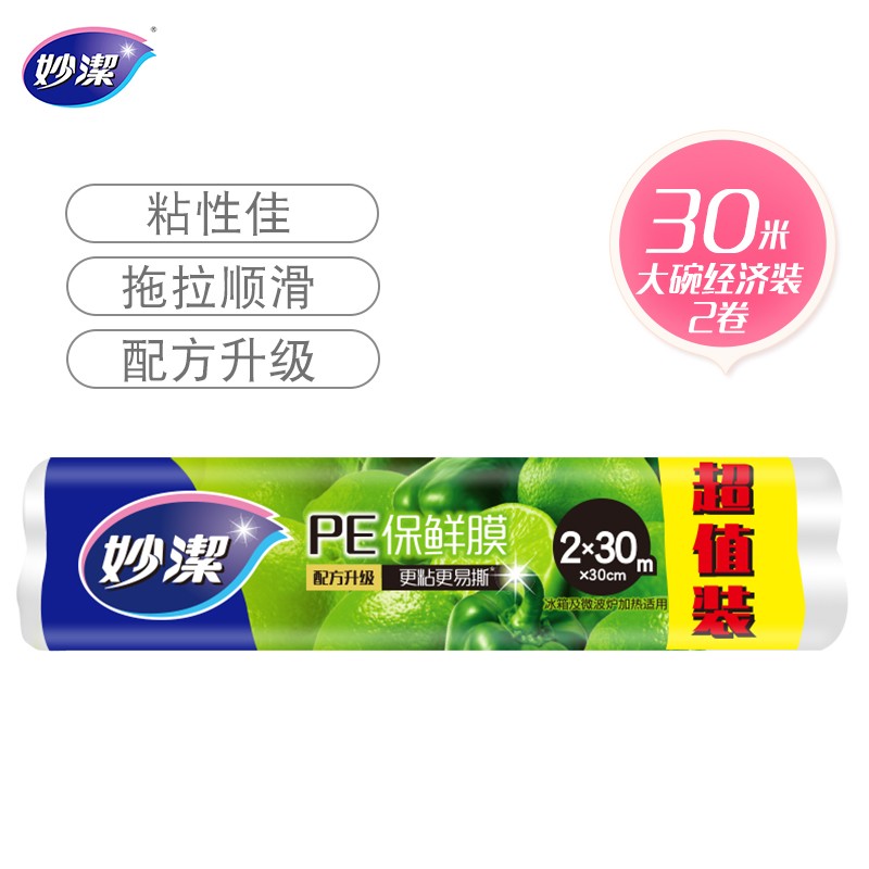 妙洁 保鲜膜缠绕膜 超值经济装30米*30cm*2卷 微波炉冰箱适用 60米装 M100E2(zhyghf_981206201)SKU:yzwhyp907572