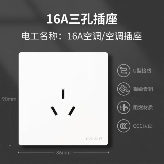 视贝(SEEBEST)三孔16A空调插座 开关面板电源白色86型全屏大板智美系列 (zhyghf_221723787)SKU:yzwhyp908170