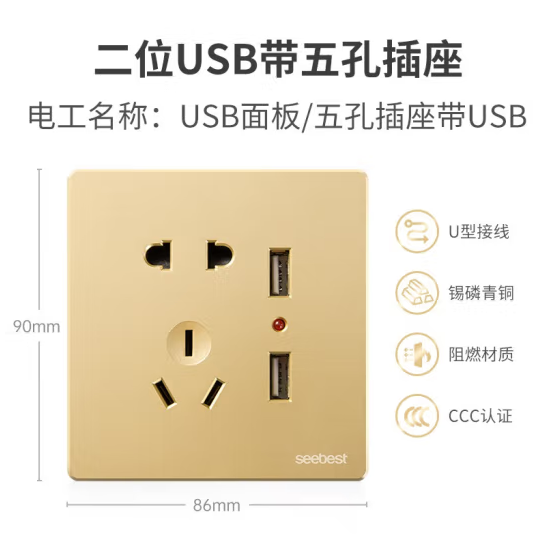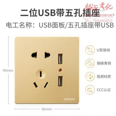 视贝(SEEBEST)二位USB带五孔插 开关插座墙壁开关金色系列 (zhyghf_221723956)SKU:yzwhyp908640