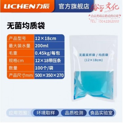 首页 > 仪器仪表 > 样品前处理及制备仪器 > 力辰科技(lichen)无菌均质袋一次性采样袋带压条实验室微生物环境取样灭菌袋 12x18cm (100个/袋) (zhyghf_221720051)SKU:yzwhyp909740