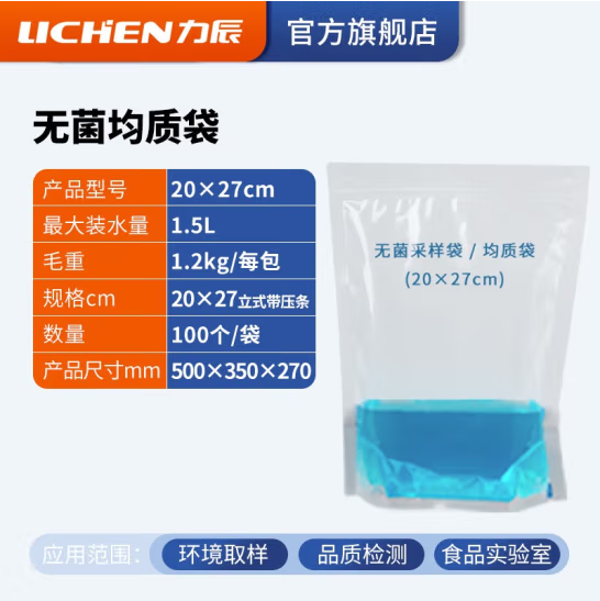 首页 > 仪器仪表 > 样品前处理及制备仪器 > 力辰科技(lichen)无菌均质袋一次性采样袋带压条实验室微生物环境取样灭菌袋 20x27cm (100个/袋) (zhyghf_221720053)SKU:yzwhyp909742