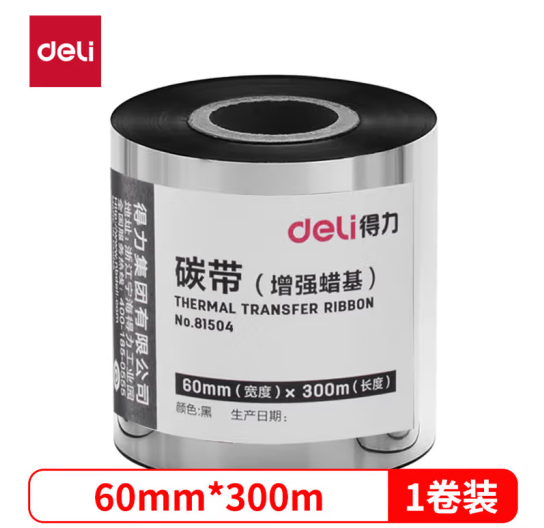 首页 > 办公用品 > 色带 > 得力(deli)60mm*300m热转印条码打印机 标签机打印碳带 通用型增强蜡基碳带81504(单支装) (zhyghf_23097382)SKU:yzwhyp911462