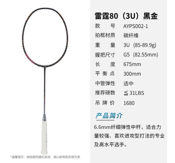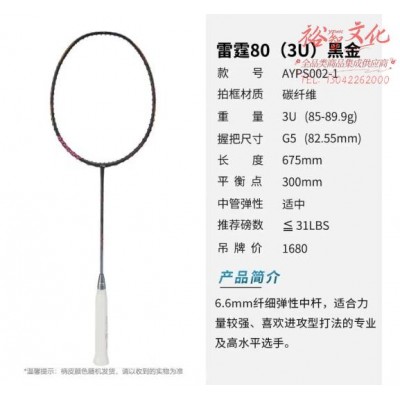 李宁(LI-NING)羽毛球拍谌龙同款全碳素单拍 雷霆80专业大赛级球拍(3U)空拍(zhyghf_30012291)SKU:yzwhyp912400