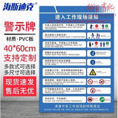 首页 > 建筑建材 > 其他防护用品 > 海斯迪克 工厂车间警示标识警告标志 1个 40*60CM 进入工作现场须知(01) PVC板 HK-3005 (zhyghf_27002351)SKU:yzwhyp913132
