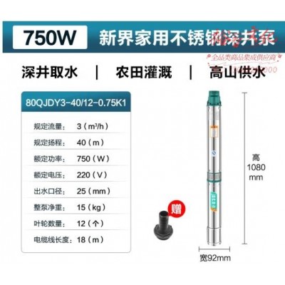 首页 > 建筑建材 > 电动工具 > 新界不锈钢深井泵家用2/3方高扬程大流量农用井用深水泵潜水泵220V 80QJDY3-40/12-0.75K1 (zhyghf_23001166)SKU:yzwhyp913309