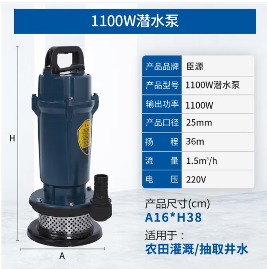 臣源潜水泵220V家用污水泵铝壳抽水泵井用农用排污泵小型高扬程清水泵 (zhyghf_23001304)SKU:yzwhyp914471