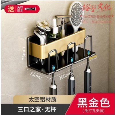 枪灰 牙刷置物 架 免打孔漱口杯牙杯壁挂式收纳架 黑金-三人铝牙刷架(免打孔) (zhyghf_1230407)SKU:yzwhyp915011