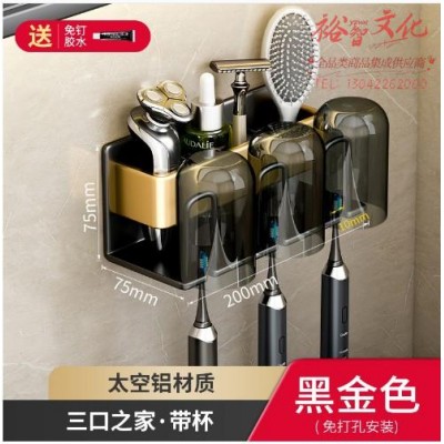 牙刷置物 架 免打孔漱口杯牙杯壁挂式收纳架 黑金-三人铝牙刷架 3漱口杯(免打孔) (zhyghf_1230416)SKU:yzwhyp915259