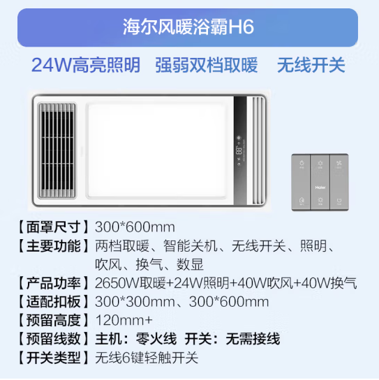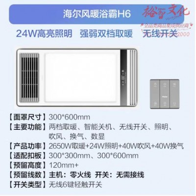 海尔风暖浴霸大功率取暖24W大照明暖风机浴室排气照明一体集成吊顶H6(zhyghf_23094335)SKU:yzwhyp915871