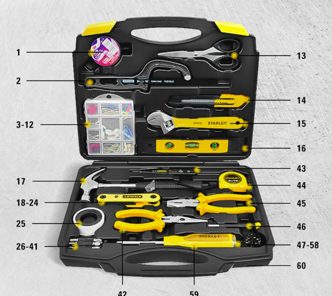首页 > 建筑建材 > 手动工具 > 史丹利史丹利工具箱套装 螺丝刀手动工具套帆布扳手钳子卷尺电工家用 60件套工具套装MC-058-23(zhyghf_23093553)SKU:yzwhyp915944