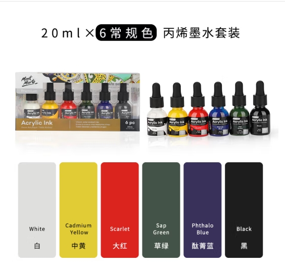 蒙玛特(Mont Marte)丙烯颜料 丙烯墨水套装防水手绘diy涂鸦流体画马克笔补充液 6色20ml常规PMNK0001 (SKU:yzwhyp917061