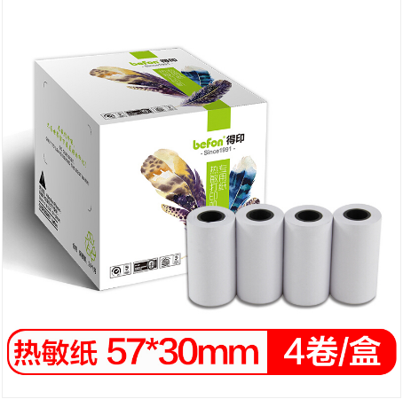首页 > 纸及纸质品 > 纸及纸板(不包含复印纸) > befon得印 57*30mm热敏收银纸 刷卡机 超市收银机小票纸 4卷/盒 口袋打印机 喵喵机/咕咕机热敏纸 (SKU:yzwhyp920017