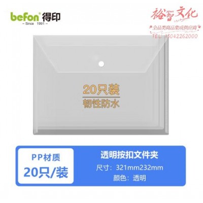 得印(befon) A4防水透明按扣文件袋 塑料档案袋公文袋 产检资料袋 学生试卷收纳袋 办公用品 20只装7063 (SKU:yzwhyp920064