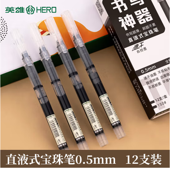 英雄0.5mm黑色直液式走珠笔 速干直液式中性笔 水笔全针管学生办公用品1开学文具12支装 (SKU:yzwhyp920434