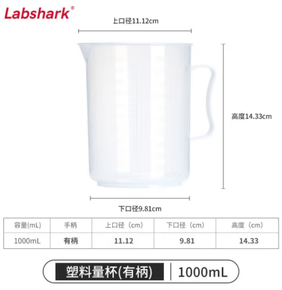 首页 > 仪器仪表 > 生物、医学样品制备设备 > 比克曼生物 LABSHARK 塑料量杯带刻度加厚具嘴透明大容量带柄无柄PP材质耐热耐高温实验室用品【有柄】1000mL 1个(5个起订) (SKU:yzwhyp921399