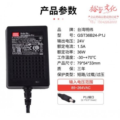 明纬(MEANWELL)开关电源24V 1.5A 适配器企业级两插进线 GST36B24-P1J(不含输入线) (SKU:yzwhyp923086