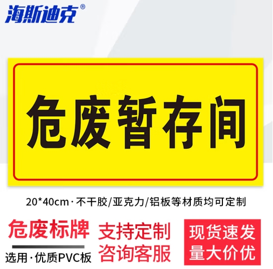 首页 > 建筑建材 > 其他防护用品 > 海斯迪克 危废警示标志牌 1个 危废暂存间20×40CM PVC板 化学品仓库环境保护标识牌 HK570 (SKU:yzwhyp924964
