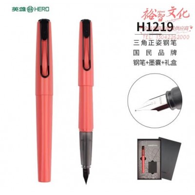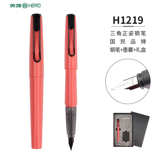 英雄(HERO)钢笔礼盒年会奖品 H1219铱金笔探索者系列 浅红黑夹 学习用品墨囊两用书法练字硬笔 (SKU:yzwhyp929077