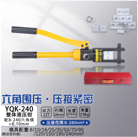 首页 > 建筑建材 > 手动工具 > MNZe 电缆手动液压钳压线钳YQK-70/120/240/300液压压接钳铜铝鼻压接 YQK-240(配8-240六角模)铁盒 (SKU:yzwhyp929214