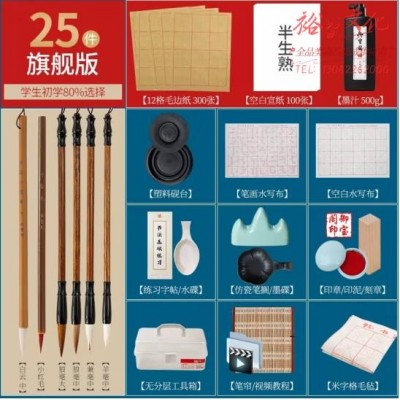 御宝阁 文房四宝毛笔套装初学者入门小学生书法宝笔墨纸砚毛毡砚台带盖字帖水写布笔架墨碟毛笔练字纸 旗舰25件【收纳盒】 (SKU:yzwhyp929653