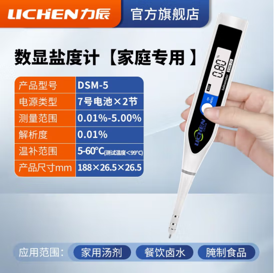 首页 > 仪器仪表 > 其他分析仪器 > 力辰科技(lichen)盐度计测量仪食品汤汁卤水厨房咸度电子盐度表数显盐份测试笔 DSM-5 测量范围:0.01-5%家庭专用 (SKU:yzwhyp930905