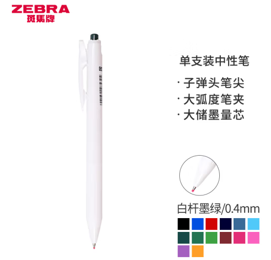 斑马牌(ZEBRA)0.4mm按动子弹头中性笔 彩色学生绘画签字笔标注填色手账笔水笔 JJS29-R1 白杆墨绿 单支装 (SKU:yzwhyp931760