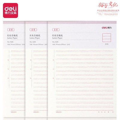 首页 > 纸及纸质品 > 纸及纸板(不包含复印纸) > 得力(deli)3本16K/20张双线信纸信稿纸 入党申请专用纸笔记本子信签纸草稿纸作业本 3428 70g (9本起订) (SKU:yzwhyp934233