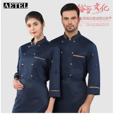 AETEL 厨师工作服男女长袖秋季装 AETEL-QJ领口美食长袖 蓝色单上衣【M-4XL码 下单请咨询】 (SKU:yzwhyp936626