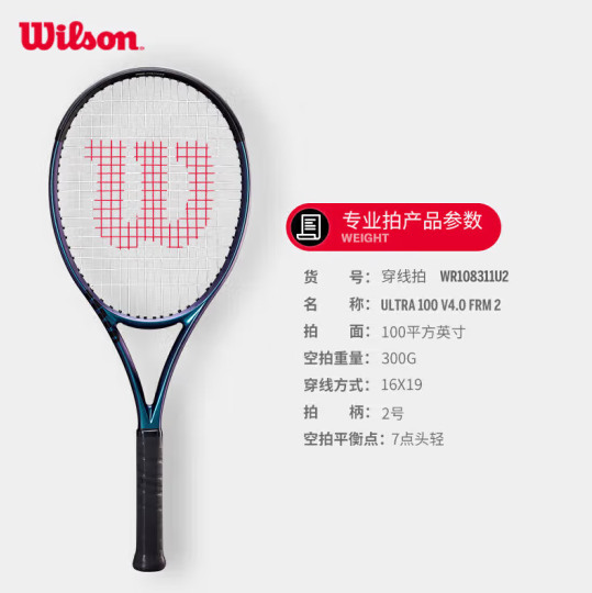 Wilson威尔胜 全碳素成人专业拍网球拍ULTRA 100 V4.0 FRM 2(已穿线) WR108311U2 (SKU:yzwhyp938112