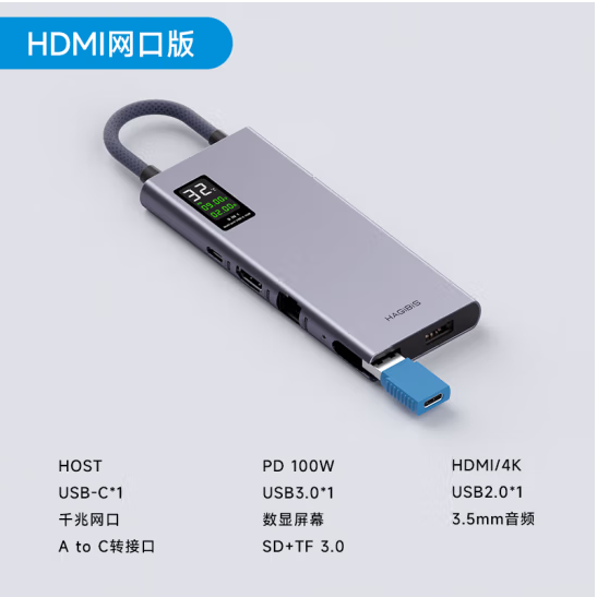首页 > 信息化设备 > 集线器 > 海备思TSX102带屏拓展坞数显扩展坞USB-C转换器网口转接头Type-C转HDMI苹果Mac雷电4转接器 深空灰【HDMI 网口版】 (SKU:yzwhyp938202