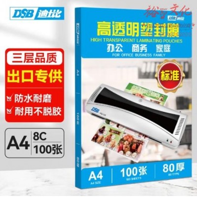 DSB(迪士比)A4 8c厚 塑封膜 高清透明文件过塑膜照片相片覆膜塑封纸护卡膜塑封皮 218*305mm 100张/盒 (SKU:yzwhyp939498