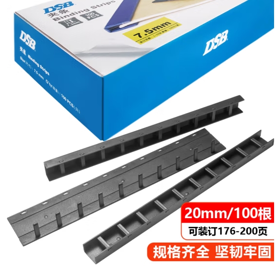 首页 > 办公用品 > 文具 > DSB(迪士比)10孔装订夹条 黑色 A4 20mm 装订200页 办公用品标书合同装订打孔机塑料压条 100根/盒 (SKU:yzwhyp939552