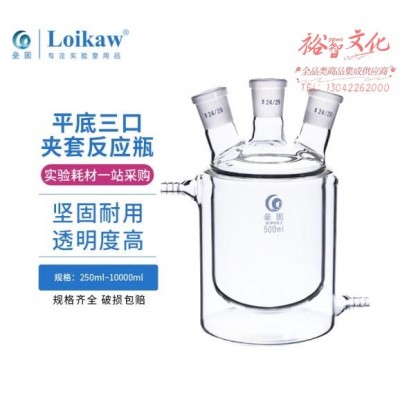 垒固 三口夹套反应瓶 平底内圆外 平三口双层反应烧瓶 高硼硅玻璃反应瓶 500ml/24*4 (SKU:yzwhyp940383