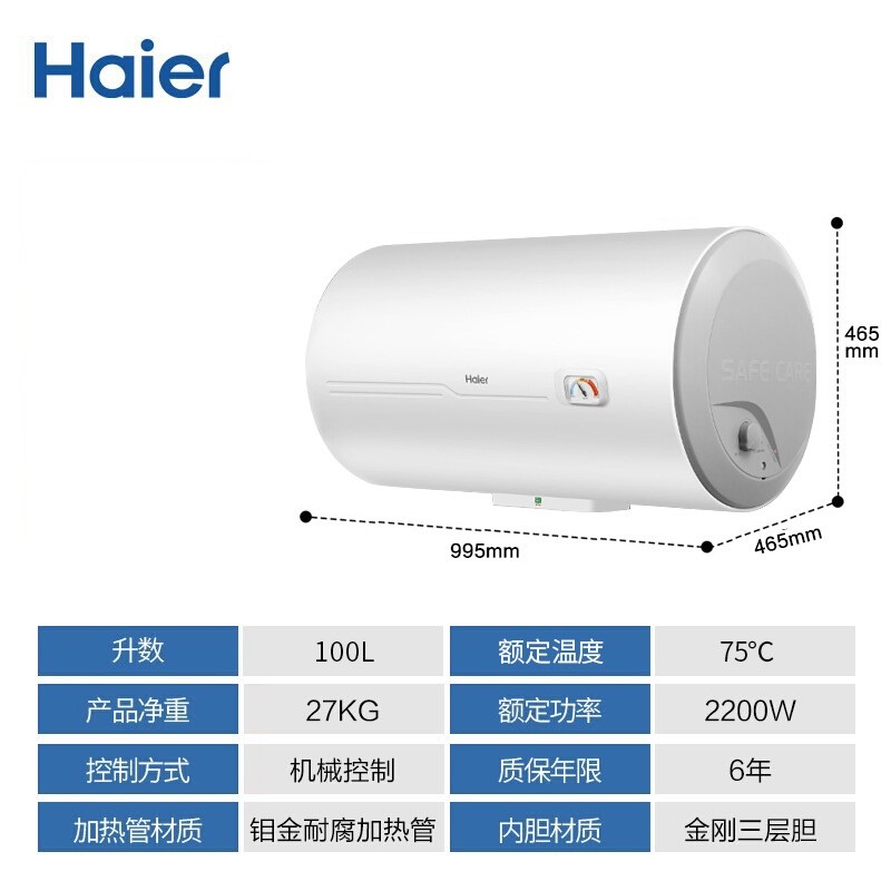 海尔 100升家用速热2200W储水式洗澡 ES100H-CK3(1) 机械式(SKU:yzwhyp941977