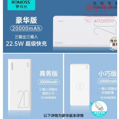 罗马仕(ROMOSS) 充电宝20000毫安时18W级双向快充兼容苹果PD大容量移动电源 (SKU:yzwhyp942951