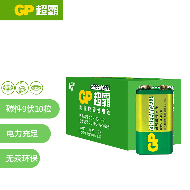 超霸(GP)9V碳性电池九伏10粒装 适用于玩具/遥控器/无线麦克风/电子仪表 GP1604G(SKU:yzwhyp943032