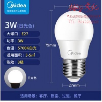 美的(Midea)led灯泡节能E27大螺口螺纹球泡3W正白单只装(SKU:yzwhyp943853