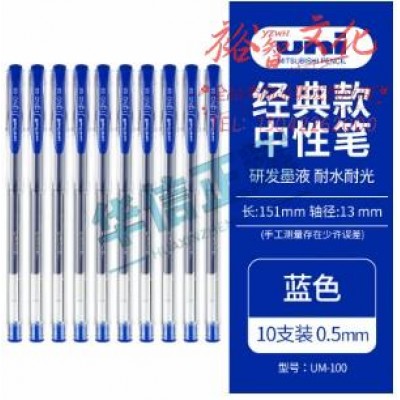 三菱(Uni)UM-100/0.5mm(蓝色)学生用中性笔签字笔(替芯UMR-5)10支装原装SKU:yzwhyp951109