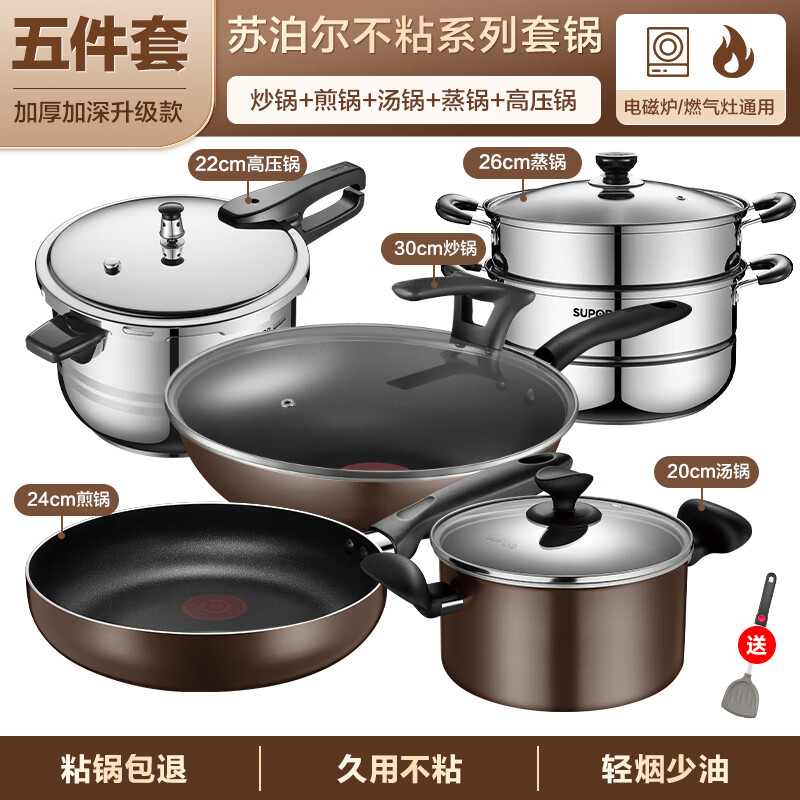 苏泊尔(SUPOR)锅具套装不粘锅家用不粘菜炒锅平底锅厨房全套装锅电磁炉燃气通用 【炒 煎 汤 高 蒸】 5件套SKU:yzwhyp955202