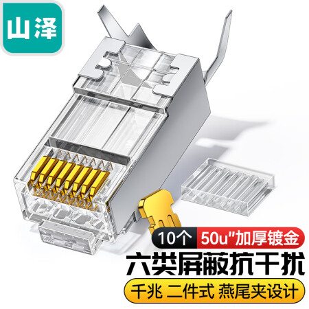 山泽XWJ6010U 六类屏蔽水晶头 50U加厚镀金RJ45网络接头 工程级8P8C电脑网线连接器 Cat6两件式接头 10个装SKU:yzwhyp962138