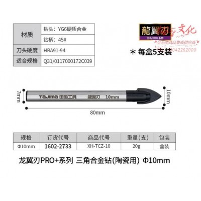 田岛(TAJIMA)日本TAJIMA三角合金钻瓷砖钻陶瓷玻璃钻头打孔黑漆防锈专业陶瓷钻 龙翼刃10mm(5支装1602-2733SKU:yzwhyp963474