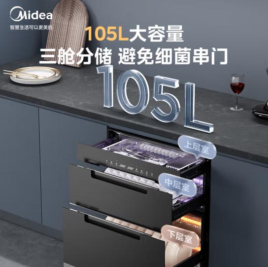 美的(Midea)110YQ2消毒柜嵌入式 厨房餐具碗柜碗筷茶杯 紫外线二星消毒 105L三层三门分腔大容量 SKU:yzwhyp963789