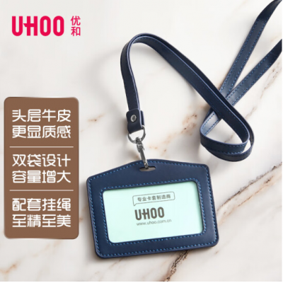 优和(UHOO) 6873 真皮卡套头层牛皮商务证件卡套横式1个卡套配送真皮挂绳员工胸牌工牌厂牌工作证宝蓝